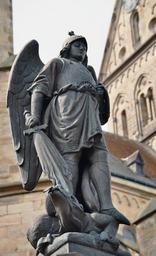 | Keywords: Mettingen Michaelsbrunnen 12.jpg Archangel Michael Memorial Michaelsbrunnen at the market square of Mettingen Kreis Steinfurt North Rhine-Westphalia Germany It is listed as a cultural heritage monument de Erzengel-Michael-Figur auf dem Michaelsbrunnen auch Michaelsdenkmal in Mettingen Kreis Steinfurt Nordrhein-Westfalen Deutschland Das Denkmal wurde im Jahr 1902 errichtet Die 2 05 Meter hohe Figur des Erzengels des Schutzpatrons der Deutschen ist eine Galvanoplastik hergestellt von der Galvanoplastischen Kunstanstalt Geislingen a d Steige Die komplette Brunnenanlage steht seit 1984 als Objekt der Volksfrömmigkeit unter Denkmalschutz Inventar-Nr A 05 Die im Lauf der Zeit erheblich beschädigte Michael-Figur wurde jedoch 1988 anlässlich der 900-Jahr-Feier der Gemeinde Mettingen durch einen Nachguss ersetzt Diesen schuf der Borghorster Künstler Otto Breuing den Bronzeguss besorgte die Kunstgießerei Anft Drensteinfurt Das Original befindet sich seither im Inneren der St -Agatha-Kirche 05 own J -H Janßen 2011-05 Michaelsbrunnen Mettingen Statue replicas 2011 in Mettingen 201105 Mettingen May 2011 in Germany 201105 Mettingen May 2011 photographs Mettingen Bilder von J -H Janßen Cc-zero FoP-Germany |