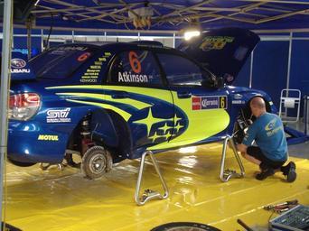 Keywords: MEX 2008 RB 06 service 3.jpg Chris Atkinson's Subaru Impreza WRC car is serviced prior to the start of the 2008 Rally Mexico at rally base in the Poliforum in Leon Mexico Own 2008-02-27 Joshbaumgartner 2008 Rally Mexico Chris Atkinson in 2008 Subaru Impreza WRC2007 World Rally Championship automobile maintenance |