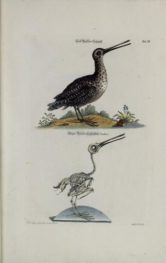 Keywords: Meyer Zeit-Vertreib 1 Tafel 011.jpg Angenehmer und nützlicher Zeit-Vertreib mit Betrachtung curioser Vorstellungen allerhand kriechender fliegender und schwimmender auf dem Land und im Wasser sich befindender und nährender Thiere sowohl nach ihrer Gestalt und äusserlichen Beschaffenheit als auch nach der accuratest davon verfertigten Structur ihrer Scelete oder Bein-Cörper nebst einer deutlichen so physicalisch und anatomisch besonders aber osteologisch und mechanischen Beschreibung derselben / nach der Natur gezeichnet gemahlet in Kupfer gestochen und verlegt von Johann Daniel Meyer Miniatur-Mahler in Nürnberg; Band 1; Nürnberg 1748<br /> Tafel 11 Wasserschnepfe http //resolver sub uni-goettingen de/purl PPN624674746 1748 Creator Johann Daniel Meyer PD-old-100 Angenehmer und nützlicher Zeit-Vertreib 1 Meyer Snipes in art Unidentified Gallinago Scolopacidae anatomy Charadriiformes skeletons |