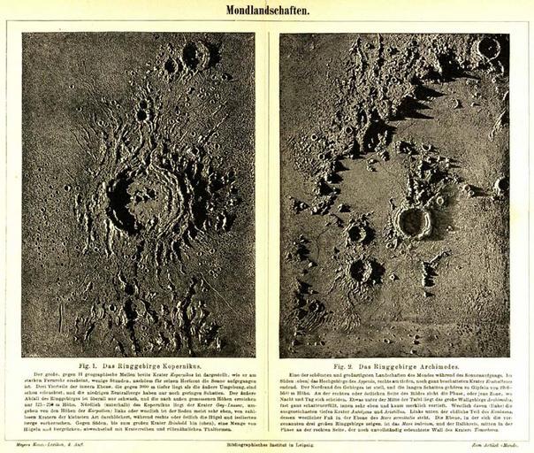 Keywords: Meyers b11 s0739b.jpg Geography of the Moon 1 Around the crater Copernicus 2 In the neighbourhood of the Montes Archimedes Mondlandschaften Fig 1 Das Ringgebirge Kopernikus Der große gegen 11 geographische Meilen breite Krater Kopernikus ist dargestellt wie er am starken Fernrohr erscheint wenige Stunden nachdem für seinen Horizont die Sonne aufgegangen ist Drei Vierteile der inneren Ebene die gegen 3000 m tiefer liegt als die äußere Umgebung sind schon erleuchtet und die niedrigen Zentralberge haben nur noch geringen Schatten Der äußere Abfall des Ringgebirges ist überall nur schwach und die nach außen gemessenen Höhen erreichen nur 125-250 m Höhe Nördlich unterhalb des Kopernikus liegt der Krater Gay-Lussac umgeben von den Höhen der Karpathen; links oder westlich ist der Boden meist sehr eben von zahllosen Kratern der kleinsten Art durchlöchert während rechts oder östlich die Hügel und isolierten Berge vorherrschen Gegen Süden bis zum großen Krater Reinhold hin oben eine Menge von Hügeln und Bergrücken abwechselnd mit Kraterreihen und rillenähnlichen Thalformen Fig 2 Das Ringgebirge Archimedes Eine der schönsten und großartigsten Landschaften des Mondes während des Sonnenaufgangs Im Süden oben das Hochgebirge des Appenin rechts am tiefen noch ganz beschatteten Krater Eratosthenes endend Der Nordrand des Gebirges ist steil und die langen Schatten gehören zu Gipfeln von 2200-5600 m Höhe An der rechten oder östlichen Seite des Bildes zieht die Phase oder jene Zone wo Tag und Nacht sich scheiden Etwas unter der Mitte der Tafel liegt das große Wallgebirge Archimedes fast ganz schattenerfüllt innen sehr eben und kaum merklich vertieft Westlich davon links die ausgezeichneten tiefen Krater Autolycus und Aristillus Links unten der südliche Teil des Kaukasus dessen westlicher Fuß in der Ebene des Mare serenitatis steht Die Ebene in der sich die vorgenannten drei großen Ringgebirge zeigen ist das Mare imbrium und der Halbkreis mitten in der Phase an der rechten Seite der noch unvollständig erleuchtete Wall des Kraters Timorheres richtig Timocharis Meyers Konversationslexikon 1885-90 Bibliographisches Institut 11 PD-old-70-1923 extract Maps from Meyers Konversationslexikon 4th edition Copernicus lunar crater Archimedes crater Montes Apenninus |