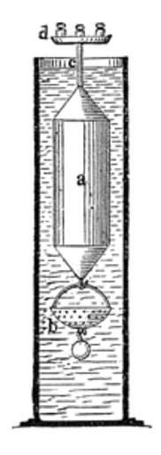 Keywords: Meyers b1 s0742 b1.png de Nicholsonsches Gewichtsaräometer oder Hydrometer a Hohlzylinder aus Messingblech b Körbchen für zu untersuchende Gegenstände c Marke d Schälchen zum Auflegen von Gewichten Meyers b1 s0742 jpg ca 1885 author PD-Meyers Hydrometers Images from Meyers Konversationslexikon 4th edition - text figures