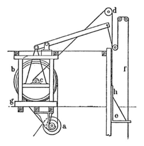 | Keywords: Meyers b2 s0070 b1.png de Fahrstuhl Stuhlwinde a Transmissionswelle b Riemenscheibe c Welle als Windetrommel d Leitrolle e Stuhl zur Aufnahme der Last f Zugseil g Bremsbacken h Leitbaum Meyers b2 s0070 jpg ca 1885 author PD-Meyers Elevators Images from Meyers Konversationslexikon 4th edition - text figures |
