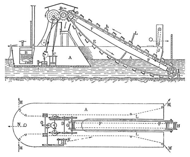 Keywords: Meyers b2 s0254 b1.png de Eimerbagger mit Dampfbetrieb oben Querschnitt unten Grundriss A Schiff B Dampfkessel C Dampfmaschine D Räderwerk E Eimerkette F Rahmen mit Leitrollen Leiter G obere Trommel H untere Trommel J Kette K Winde L Gleitschienen M Quer-Ankerketten N Ankerkette gegen den Strom O Welle Meyers b2 s0254 jpg ca 1885 author PD-Meyers Steam dredgers Images from Meyers Konversationslexikon 4th edition - text figures |