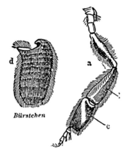 | Keywords: Meyers b2 s0904 b1.png de Arbeitsbiene a “ Hinterbein b “ Körbchen c “ Tarsalglied d “ BĂĽrstchen auf der Unterseite von c Meyers b2 s0904 jpg ca 1885 author PD-Meyers Unidentified Anthophila Apoidea legs Images from Meyers Konversationslexikon 4th edition - text figures |