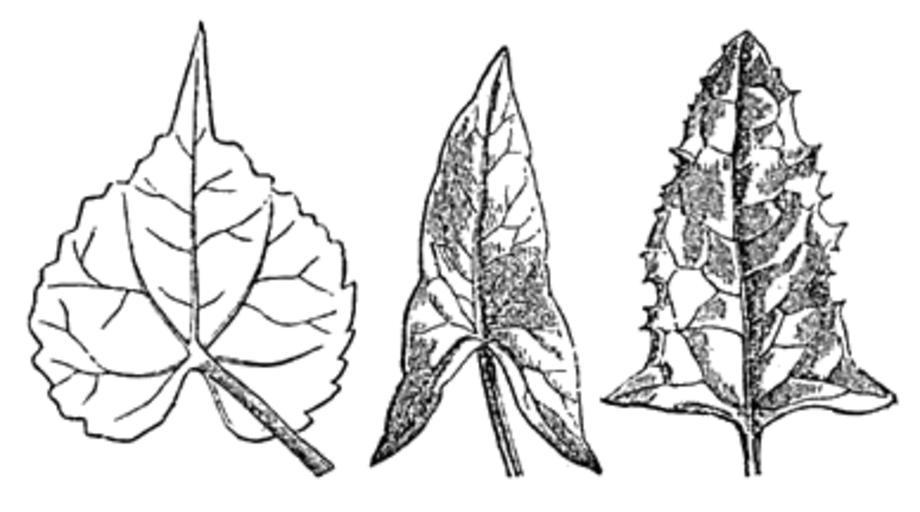 Keywords: Meyers b2 s1014 b3.png de links herzförmiges Blatt Mitte pfeilförmiges Blatt rechts spießförmiges Blatt Meyers b2 s1014 jpg ca 1885 author PD-Meyers Leaf diagrams Images from Meyers Konversationslexikon 4th edition - text figures