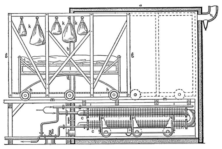 Keywords: Meyers b4 s0708 b1.png de Eiserner Desinfektionsapparat von Mercke a Doppelte Wand; b Thüröffnung durch welche der auf den Rollen h längs der Schienen m bewegliche Wagen g mit den zu desinfizierenden Betten und Kleidern k hineingeschoben wird c Kupferspiralen zum Heizen Meyers b4 s0708 jpg ca 1885 author PD-Meyers Images from Meyers Konversationslexikon 4th edition - text figures Disinfection |