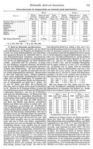 | Keywords: Meyers b5 s0311.jpg 5 311 title Precious Metals Price and Relative Worth with chart of precious metals gold/silver prices and relative worth in each nation c 1888 Titel Edelmetalle Preis und Wertrelation mit der Grafik von Gold/Silber-Preis in jeder Nation ca 1888 <br><br><table class wikitable> <tr align center><td> </td><td colspan 3>Gold</td><td colspan 3>Silber</td></tr> <tr align center><td>Länder</td><td> Brutto verbrauch Kilogr fein</td><td>Abzug für verwendetes altes Material</td><td>Netto verbrauch Kilogr fein</td><td>Brutto verbrauch Kilogr fein</td><td>Abzug für verwendetes altes Material</td><td>Netto verbrauch Kilogr fein</td> <tr><td> nowrap Vereinigte Staaten <br>von Amerika</td><td>15000 </td><td>10 Proz </td><td>13500 </td><td>120000</td><td>15 Proz </td><td>102000</td> <tr><td> Großbritannien</td><td>20000</td><td>15 </td><td>17000</td><td> 90000</td><td>20 </td><td>72000</td> <tr><td> Frankreich</td><td>21000 </td><td>20 </td><td>16900</td><td>100000</td><td>25 </td><td>75000</td> <tr><td> Deutschland</td><td>14700</td><td>20 </td><td>11760</td><td>100000</td><td>25 </td><td>75000</td> <tr><td> Schweiz</td><td>15000</td><td>25 </td><td>11250</td><td> 32000</td><td>25 </td><td>24000</td> <tr><td> Österreich-Ungarn</td><td> 2900</td><td>15 </td><td> 2465</td><td> 40000</td><td>20 </td><td>32000</td></tr> <tr><td> Italien</td><td> 6000</td><td>25 </td><td> 4500</td><td> 25000</td><td>25 </td><td>19000</td></tr> <tr><td> Rußland</td><td> 3000</td><td>20 </td><td> 2400</td><td> 40000</td><td>20 </td><td>32000</td></tr> <tr><td> Zusammen </td><td>97600</td><td> -</td><td>79775</td><td>547000</td><td> -</td><td>431000</td></tr> <tr><td> Alle übrigen Kulturländer</td><td> 5000</td><td>20 Proz </td><td> 4000</td><td> 53000</td><td> -</td><td> 40000</td></tr> <tr><td> Insgesamt </td><td>102600</td><td> -</td><td>83775¹</td><td>600000</td><td> -</td><td>471000²</td></tr> </table> ¹ D h 233 7 Mill Mk - ² D h 84 8 Mill Mk 10 May 2009 |