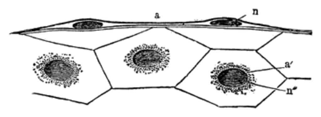 Keywords: Meyers b5 s0708 b1.png de Pflasterepithel bei a von der Seite bei a ² von oben gesehen n Kern n ² Kernkörperchen Meyers b5 s0708 jpg ca 1885 author PD-Meyers Images from Meyers Konversationslexikon 4th edition - text figures Epithelial cells |