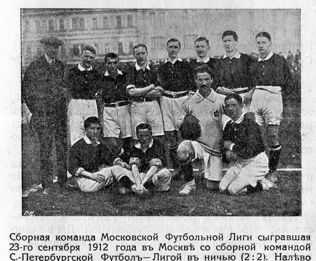 | Keywords: MFL football team 1912.jpg ru Сбо ная команда осковской футбольной лиги сыг авшая 23 сентяб я 1912 года в оскве со сбо ной командой Санкт-Пете бу гской Футбол-Лиги вничью 2 2 Russian illustrated magazine unknown author < 1914 PD-old Association football in the Russian Empire 1912 in association football 23 September |