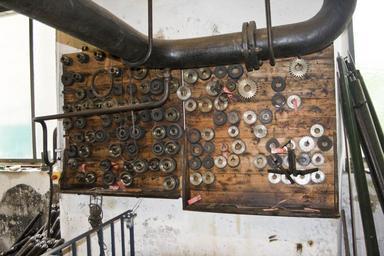 Keywords: MG 0919 ersatzzahnraeder.jpg Zahnradbrett in der Tuchfabrik Müller Euskirchen-Kuchenheim Own 2008-05-18 Sozi pd Cc-pd Mechanical parts Tuchfabrik Mueller Gears Files by User Sozi
