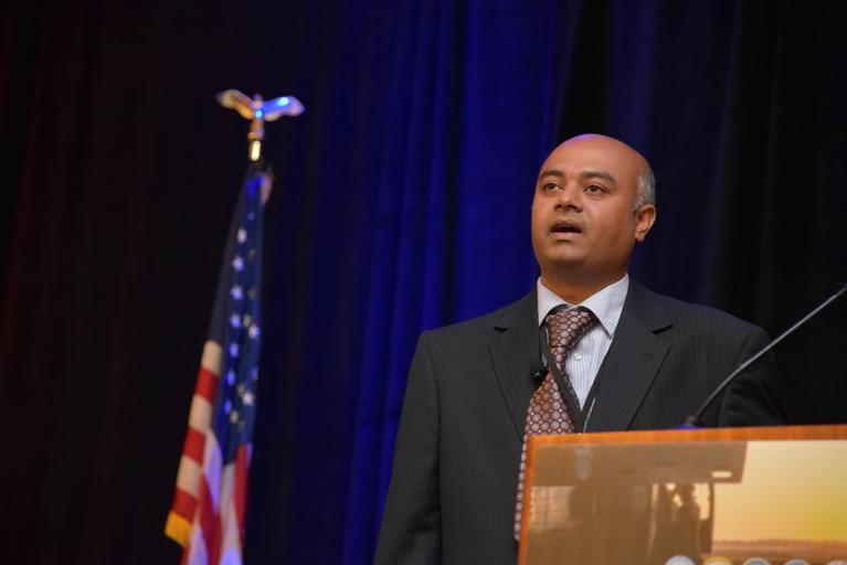 | Keywords: Dr. Srinivas Laxminarayan, Ph.D. at TATRC's BHSAI was awarded 3rd place for his presentation on "Preventing Heat Injuries by Predicting Human Core Temperature" at the MHSRS 2015 Young Investigator Competition. Photo by Melissa Myers, USAMRMC Public Affairs |