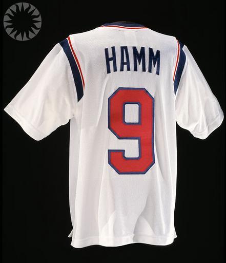 Mia Hamm, soccer jersey,(1996), reverse view, from the US team's 1996 Olympic gold medal in Atlanta. Cultural History artifacts for the SITES show "Sports: Breaking Records, Breaking Barriers"