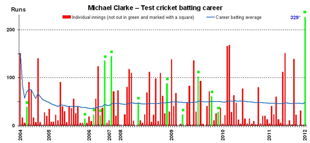 | Keywords: Michael Clarke batting v3.png test match performance of cricketer Michael Clarke and was created by en wiki w user EdChem Each bar indicates a single test match innings red ones for innings in which he was dismissed green ones for innings in which he batted but was not out The blue line shows career batting average as at the end of each innings 6 January 2012 The graph was generated with Microsoft Excel 2003 the resulting chart being copied to Adobe Photoshop 9 and saved in png format using data from w Cricinfo http //stats espncricinfo com/ci/engine/player/4578 html class 1;orderby start;template results;type batting;view innings and w Howstat http //www howstat com au/cricket/Statistics/Players/PlayerProgressBat asp PlayerID 3067 It was created as an alternative to w File Michael_Clarke_batting png and w File Michael_Clarke_batting_v2 png for discussion at w WT CRICKET; this version is current as at 5 January 2012 and includes Clarke's 329 high score completed on that date and was prepared on 6 January 2012 EdChem other versions w File Michael Clarke batting png w File Michael Clarke batting v2 png w File Michael Clarke batting v4 png EdChem wikipedia en Cc-zero Original upload log page en wikipedia Michael+Clarke+batting+v3 png wikitable - 2012-01-06 13 52 46 888× 410× EdChem This graph details the test match performance of cricketer Michael Clarke and was created by en wiki user EdChem Each bar indicates a single test match innings red ones for innings in which he was dism - Uncategorized 2016 July 24 |