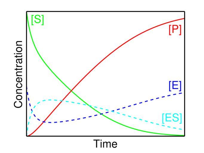 | Keywords: Michaelis Menten S P E ES.svg Michaelis “Menten kinetics parameter values used were k<sub>f</sub> 0 001 k<sub>r</sub> 0 0001 k<sub>cat</sub> 0 1 S<sub>0</sub> 500 E<sub>0</sub> 200 P<sub>0</sub> ES<sub>0</sub> 0 evaluated to t 50 as in http //se wtb tue nl/sewiki/biological_systems/man this example own U+003F 2011-07-29 Cc-zero Enzyme kinetics |