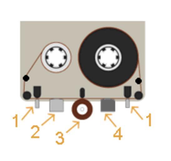 Keywords: Microcasete-dibujo.GIF es Dibujo que muestra las partes de la platina de un microcasete <br>1 Guías<br>2 Cabeza de lectura escritura<br>3 Rodillo de goma<br>4 Cabeza borradora own Gelpgim22 10/6/09 Microcassette History of sound recording
