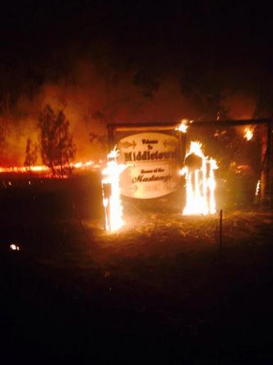 | Keywords: Middleton Sign Burning CALTRANS.jpg en Middletown welcome sign on fire in the 2015 Napa County California Valley Fire which started on 12 September 2015 and had burned over 40 000 acres in a day Original photo caption Photo taken last night from one of our crews on the scene Crews reporting downed lines all over the roads and the fire is not losing strength Please stay away from the area and off highway 29 and 175 which were closed yesterday The Valley fire has burned 40 000 acres and is 0 contained CALTRANS https //www facebook com/CaltransD1/photos/a 630444600330154 1073741825 327888130585804/947840835257194/ type 1 theater CALTRANS 2015-09-13 PD-CAGov 38 75247 -122 615237 at center of town sign location is unknown Valley Fire |
