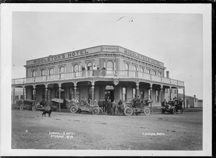 | Keywords: blackandwhite monochrome photo border building architecture outdoor black and white View of Middleton's Hotel at Opunake. Six touring cars with passengers are lined up outside the hotel, with several people on the upstairs verandah. The hotel has the sign E. O'Meara above the upstairs verandah, but the photographer's inscription says it is Connell's hotel. Photograph taken by D. Duncan (photographer at Opunake), between 1910 and 1913. Inscriptions: Inscribed - Photographer's title on negative -bottom left: Connells Hotel. Opunake. [No.] 1978bottom right: D. Duncan Photo. Quantity: 1 b&w original negative(s). Physical Description: Dry plate glass negative 4.5 x 6.5 inches Duncan, David, fl 1910s. Middleton's Hotel, Opunake - Photograph taken by David Duncan. Price, William Archer, 1866-1948 :Collection of post card negatives. Ref: 1/2-001074-G. Alexander Turnbull Library, Wellington, New Zealand. natlib.govt.nz/records/22343462 View of Middleton's Hotel at Opunake. Six touring cars with passengers are lined up outside the hotel, with several people on the upstairs verandah. The hotel has the sign E. O'Meara above the upstairs verandah, but the photographer's inscription says it is Connell's hotel. Photograph taken by D. Duncan (photographer at Opunake), between 1910 and 1913. Inscriptions: Inscribed - Photographer's title on negative -bottom left: Connells Hotel. Opunake. [No.] 1978bottom right: D. Duncan Photo. Quantity: 1 b&w original negative(s). Physical Description: Dry plate glass negative 4.5 x 6.5 inches Duncan, David, fl 1910s. Middleton's Hotel, Opunake - Photograph taken by David Duncan. Price, William Archer, 1866-1948 :Collection of post card negatives. Ref: 1/2-001074-G. Alexander Turnbull Library, Wellington, New Zealand. natlib.govt.nz/records/22343462 |
