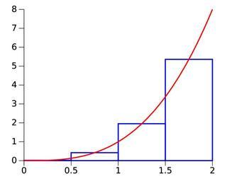 | Keywords: MidRiemann2.svg en A middle Riemann sum of x 3 over 0 2 using 4 subdivisions Own Qef 2009-06-21 Shows same thing as this bitmap version file MidRiemann2 PNG Gnuplot source <pre> set terminal svg font Bitstream Vera Sans 18 set output MidRiemann2 svg set xrange 0 2 set yrange 0 8 set xzeroaxis linetype -1 set yzeroaxis linetype -1 set xtics axis nomirror offset 0 0 5 set ytics axis nomirror offset -0 5 0 set key off set border 0 set samples 100 plot '-' using 1 1 1 1 with boxes fill linetype rgbcolor blue linewidth 3 0 25 0 75 1 25 1 75 e plot x x x with line linetype rgbcolor red linewidth 3 </pre> Qef Riemann integral Images with Gnuplot source code |