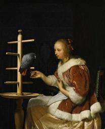 | Keywords: Mieris 1, Frans van - A Young Woman in a Red Jacket Feeding a Parrot - 1663.jpg Artwork Creator Frans van Mieris d Ä A Young Woman in a Red Jacket Feeding a Parrot 1663 Oil on panel in 8 8 6 9 private collection Location http //www nationalgallery org uk/paintings/research/a-woman-in-a-red-jacket-feeding-a-parrot discusses differences between it and its oil on copper version object history sold for £ 3 625 250 at Sotheby ™s on 3 Decembre 2008 http //www sothebys com/en/auctions/ecatalogue/2008/old-master-paintings-evening-sale-l08036/lot 25 html http //www artnet de/Artists/LotDetailPage aspx lot_id 893CF50E98D3EF512F8D0670A28D0D18 http //essentielle lalibre be/fr/wp-content/uploads/2009/01/lle118brafavanmeiris-a5 jpg F van Mieris fect Anno 1663 signature and date Other versions PD-old-100 Frans van Mieris I 1663 17th-century paintings in unidentified private collections 1663 paintings Baroque portraits of women Feeding animals in art Portrait paintings of women with birds Fur garments in art 17th-century oil portraits of women Portrait paintings of sitting women Portrait paintings with parrots Women facing left in art Genre paintings by Frans van Mieris I Images from Sotheby's Paintings by Frans van Mieris I with fur 1660s portrait paintings Females with birds in art Uploads by Mattes from external sources |