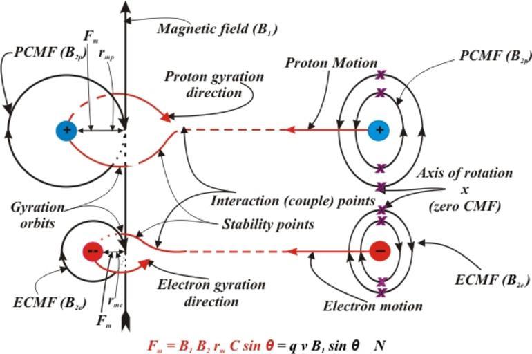 | Keywords: MIH2.JPG  en Fig 2 Electron and proton CMF B2 e and B2 p respectively of equal energies interacted with magnetic field B1 at specific points Resulted magnetic force Fm caused electron and proton to gyrate oppositely at specific radius own Elhagyousif Yeas Unidentified diagrams Electromagnetic forces |