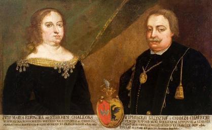 Keywords: Mikalojus Kristupas ir Marija Eleonora Chaleckiai.jpg Portrait of MikoÅ‚aj Krzysztof Chalecki and Maria Eleonora Stibichen Portret MikoÅ‚aja Krzysztofa Chaleckiego i Marii Eleonory Stybychin ca 1646 oil canvas cm 76 120 Lithuanian Art Museum accession number object history credit line MikoÅ‚aj Krzysztof Chalecki 1590 “1653 Great Sword-bearer of Lithuania was portraited with a medallion of King WÅ‚adysÅ‚aw IV Vasa His wife Maria Eleonora Stibichen d 1660 was portraited in a French dress adorned with pearls symbolizing the virtues of a woman http //www ldm lt/Dailininko_dirbtuve/images/galerija08 jpg www ldm lt Copyright expired PD-Art <gallery>File MikoÅ‚aj Krzysztof Chalecki PNG</gallery> PD-old-100 National Museum of Lithuania MikoÅ‚aj Krzysztof Chalecki 1640s portrait paintings People with medals in art People of the Polish-Lithuanian Commonwealth