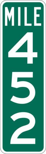 | Keywords: Mile Marker 452.svg PD MUTCD Rfc1394 457 1676 18 60 triple digit mile marker D10-3 Made using Viridian SVG Batcher this file was fabricated by a program 2009-03-05 Paul Robinson Rfc1394 Own work all rights released Public domain D10-3 - Distance Signs-3 Digit |
