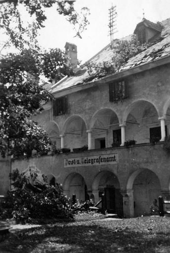 | Keywords: Millstatt Stift Innenhof oberer 01.JPG Stift Millstatt Benediktinerhof oberer Innenhof Blick gegen Süden nach einem Unwetter um 1920 in Millstatt / Kärnten / Österreich / Europäische Union In diesem Trackt war damals das Post- und Telegrafenamt untergebracht Vermutlich Aufnahmen aus der Zeit unmittelbar nach dem 19 August 1933 als es in Millstatt einen starken Sturm gab bei dem die Linde im Stift zur Hälfte brach žEin Ast durchschlug das Stiftsdach neben dem Postamt Die Linde im Lindenhof verlor den Hauptarm Volksschule Obermillstatt Chronik des Schulhauses Obermillstatt In Auszügen ausgestellt im Heimatmuseum Obermillstatt - Millstatt September 2012 Inner courtyard in the monestry of Millstatt district Spittal an der Drau in Carinthia / Austria / EU after a summer storm to the year 1933 In this Trackt was then the post and telegraph office accommodation The storm has ripped some of the branches of the old lime tree unkonwn ~ 1933 scan and upload by Joadl User Joadl/Ref2 46 48 15 75 N 13 34 12 59 E region AT Pd-old Arcades in Carinthia Chimneys in Carinthia Stift Millstatt Post offices in Austria Storm damage in Austria 1933 in Austria Unidentified Tilia Files by User Joadl |