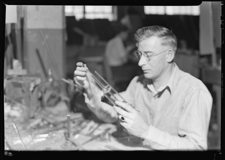 | Keywords: Millville, New Jersey - Glass bottles. L. G. Nestor Co. Tube worker blowing conductivity cell. This highly skilled... - NARA - 518651.tif Scope and content General notes 518651 Local identifier 69-RP-422 Federal Works Agency Work Projects Administration National Research Project ca 1941 - ca 1942 NARA-Author Hine Lewis Wickes 1874-1940 Photographer 1122914 <br /> Millville Cumberland New Jersey United States North and Central America inhabited place 3354813 39 4 -75 033 <br /> Still Picture Records Section Special Media Archives Services Division NWCS-S National Archives at College Park 8601 Adelphi Road College Park MD 20740-6001 1937-03-26 Record group Record Group 69 Records of the Work Projects Administration 1922 - 1944 Record group ARC 398 Lewis Hine Photographs for the National Research Project compiled 1936 - 1937 Series ARC 518291 File unit File unit ARC Variant control numbers NAIL Control Number NWDNS-69-RP-422 yes Other versions <gallery> File Millville _New_Jersey_-_Glass_bottles _L _G _Nestor_Co _Tube_worker_blowing_conductivity_cell _This_highly_skilled _-_NARA_-_518651 tif tif File Millville _New_Jersey_-_Glass_bottles _L _G _Nestor_Co _Tube_worker_blowing_conductivity_cell _This_highly_skilled _-_NARA_-_518651 jpg jpg </gallery> NARA-cooperation PD-USGov Millville New Jersey glassworking industry Glass manufacturers of the United States NARA TIF images with categorized JPGs |