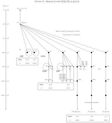 Keywords: MinDiscriminantsCoclass2Type33Sporadic.tiff This diagram shows the interface between the graphs of finite 3-groups with coclass 1 and 2 and abelianization of type 3 3 Important vertices are labelled with their SmallGroups Library identifier in angle brackets The vertices 5 7 57 and 45 are most densely populated by second 3-class groups of complex quadratic fields with discriminant d<0 The underlined counters adjacent to the ovals surrounding these vertices give the minimal absolute discriminants of the distribution TKT means transfer kernel type <br/> User DanielConstantinMayer replaced the png file by a tiff file with higher resolution thereby adding more details and in particular supplementing two missing groups <2187 274> and <2187 275> The minimal discriminants were computed in 1934 by Scholz and Taussky d -4027 and in 1982 by Heider and Schmithals the other three d values 2014-11-17 DanielConstantinMayer talk Uploads There exists a similar png file with identifier MinDiscriminantsCoclass2Type33Sporadic png which contains less information DanielConstantinMayer wikipedia en Cc-zero Original upload log en wikipedia MinDiscriminantsCoclass2Type33Sporadic tiff wikitable - 2014-11-17 14 17 1082×1192× 138920 bytes DanielConstantinMayer User DanielConstantinMayer replaced the png file by a tiff file with higher resolution thereby adding more details and in particular supplementing two missing groups <2187 274> and <2187 275> Uncategorized 2016 May 5 |