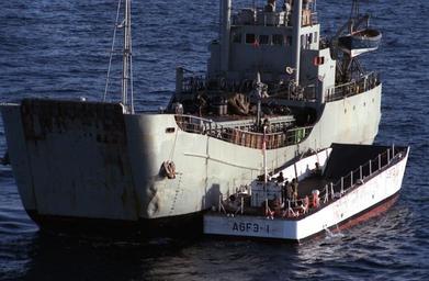 | Keywords: Mine laying ship Iran Ajr.jpg An aerial port view of the captured Iranian mine-laying ship IRAN AJR with a U S Navy landing craft alongside Former Arya Rakhsh Shot 22 Sep 1987 PD-USN Iran Ajr IRAN AJR Alongside Relations of Iran and the United States United States Navy SEALs |