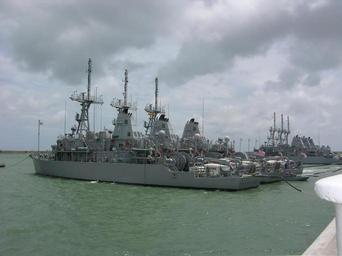 Keywords: Mine warfare ship prepare for Hurricane Dolly at NS Ingleside.jpg en 080722-N-2006A-002 INGLESIDE Texas July 22 2008 Mine countermeasures ships are in a modified Mediterranean moor at homeport Naval Station Ingleside preparing for Hurricane Dolly When in the heavy weather moor the ships are pulled away from the pier nested together and moored to a plate at the bottom of the basin U S Navy photo by Michael Antoine/Released http //www navy mil/management/photodb/photos/080722-N-2006A-002 jpg from http //www navy mil/view_image asp id 61767 U S Navy photo by Michael Antoine/Released 2008-07-22 PD-USGov-Military-Navy Mine warfare ships of the United States Naval Station Ingleside |