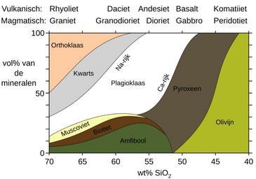 | Keywords: Mineralogy igneous rocks NL.svg nl Determinatieschema voor stollingsgesteenten op grond van mineraalinhoud en massapercentage silica SiO<sub>2</sub> Namen van vulkanische uitvloeiings- gesteenten staan boven namen van magmatische diepte- gesteenten onder Opmerking de exacte grenzen tussen gesteentenamen worden niet alleen door de silicapercentages bepaald maar hangen ook af van concentraties van andere oxiden Dit schema is dus slechts een grove manier om een gesteente te determineren own Woudloper 2009-03 File Mineralogy_igneous_rocks_EN svg; File Mineralogy_igneous_rocks_DE svg Diagrams of igneous rocks Geological diagrams in Dutch |