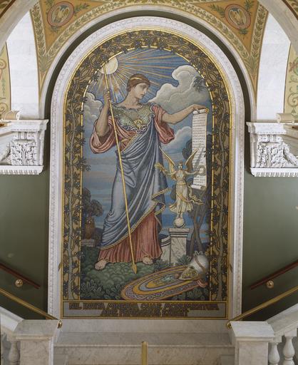 | Keywords: Minerva-Vedder-Highsmith-original.tif Second Floor East Corridor Mosaic of Minerva by Elihu Vedder within central arched panel leading to the Visitor's Gallery Library of Congress Thomas Jefferson Building Washington D C Exhibit caption Pictured on this mosaic in the arched panel is the Roman Goddess Minerva--guardian of civilization She is portrayed as the Minerva of Peace but according to the artist who created her Elihu Vedder American painter 1836 “1923 the peace and prosperity that she enjoys was attained only through warfare A little statue of Nike a representation of Victory similar to those erected by ancient Greeks to commemorate their success in battle stands next to Minerva The figure is a winged female standing on a globe and holding out a laurel wreath victory and palm branch peace to the victors Shield and Helmet Although Minerva's shield and helmet have been laid upon the ground the goddess still holds a long two-headed spear showing that she never relaxes her vigilance against the enemies of the country that she protects Scroll Her attention is directed to an unfolded scroll that she holds in her left hand On this is written a list of various fields of learning such as Architecture Law Statistics Sociology Botany Biography Mechanics Philosophy Zoology etc Minerva is therefore also the Goddess of Learning an activity that can thrive in a peaceful society Owl On Minerva's right is an owl symbolizing wisdom perched upon the post of a low parapet Inscription Beneath the mosaic is an inscription from Horace's Ars Poetica Nil invita Minerva quae monumentum aere perennius exegit and translated as Not unwilling Minerva raises a monument more lasting than bronze Source MyLOC gov Great Hall exhibit 2008 Library of Congress Prints Photographs Division LC-DIG-highsm-02125 original digital file http //memory loc gov/master/pnp/highsm/02100/02125u tif uncompressed archival TIFF version 41 MB 1897 Artist is Elihu Vedder 1836 “1923 Photographed in 2007 by Carol M Highsmith 1946 “ who explicitly http //www loc gov/rr/print/res/482_high html placed the photograph in the public domain <gallery> Minerva-Vedder-Highsmith-original jpg JPG version Minerva-Vedder-Highsmith-detail-1 jpeg Focused on Minerva's head JPG Minerva-Vedder-Highsmith jpeg Cropped out unnecessary elements JPG Head of Minerva jpg Improved version of File Minerva-Vedder-Highsmith-detail-1 jpeg JPG </gallery> LOC-image highsm 02125 Mosaic PD-old-auto 1923 Photograph Carol M Highsmith Elihu Vedder Nike's wreath Mosaics in the Thomas Jefferson Building Mosaics of Minerva |