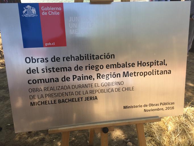 Keywords: outdoor text Paine, jueves 24 de noviembre de 2016.- El Ministro de Obras Públicas, Alberto Undurraga, y el Ministro de Agricultura, Carlos Furche, encabezaron hoy la ceremonia de inauguración del nuevo Embalse de Riego Hospital en la comuna de Paine, obra que forma parte del Plan Nacional de Construcción y Rehabilitación Pequeños Embalses del Ministerio de Obras Públicas. El Ministro Alberto Undurraga destacó que “estas obras son muy importantes por su funcionalidad para dar un mejor uso al agua y también para mejorar la calidad de vida y oportunidades de desarrollo de los habitantes de la comuna de Paine”. “Estamos haciendo otros 24 pequeños embalses como este en distintos lugares de nuestro país y dejaremos otros 8 grandes embalses en licitación o construcción, con ello durante el Gobierno de la Presidenta Bachelet, estaremos construyendo más infraestructura para el agua que nunca en la historia de Chile”, explicó el Secretario de Estado. Por su parte, el Ministro de Agricultura, Carlos Furche, manifestó que "esto es muy importante para quienes son beneficiarios directos, más de 1.000 pequeños productores que van a aumentar su capacidad productiva, de frutas y hortalizas que abastecen además a la región Metropolitana". Además, el titular del Agro agregó que esto tiene una importancia que va un poco más allá de haber cumplido a tiempo un compromiso que tomaron hace un año con los dirigentes de esta comunidad, porque permite mostrar que es posible avanzar simultáneamente en la entrega de obras como estas y en la modificación del marco regulatorio. "Ambas cosas se pueden hacer en simultáneo y es lo que estamos haciendo. De manera que esto es una buena noticia para los productores y es un ejemplo de lo que estamos haciendo en todo Chile. Tranques como estos estamos entregando casi todos los meses a lo largo del país", explicó. En la oportunidad, la Secretaria Ejecutiva de la Comisión Nacional de Riego (CNR), María Loreto Mery, destacó que “en materia de planificación del riego estamos trabajando muy de la mano con el Ministro de Obras Públicas, ya que estamos viendo las distintas necesidades multipropósito del recurso hídrico. Algunos de los embalses que estamos rehabilitando no son sólo para riego, sino también para agua potable rural o contribuir ante hechos de emergencia como un incendio forestal”. El nuevo Embalse Hospital permitirá entregar una capacidad de almacenamiento de 200.000 m3, que permitirán a 1.200 pequeños agricultores el riego de más de 2.000 hectáreas de terrenos, principalmente cultivos de frutas y verduras. Las obras, que fueron ejecutadas por el Ministerio de Obras Públicas, a través de su Dirección de Obras Hidráulicas, representaron una inversión de 484 millones de pesos, destacando el retiro de 70.000 m3 de sedimento, el revestimiento en hormigón de 300 metros del canal alimentador que trae las aguas del Río Angostura, el recambio de las 6 compuertas, la construcción de un desarenador y un vertedero para evacuación de crecidas. El Plan de Construcción y Rehabilitación Pequeños Embalses contempla la intervención de 25 embalses, de ellos 8 rehabilitaciones se encuentran terminadas, se trata de los embalses Chada y Hospital en Paine; Los Molles de Melipilla; Santa Rosa en Limache; El Principal de Pirque; Rautén Bajo en Quillota; Santa Julieta y Concepción en Ovalle. Además, de otros 2 en ejecución: Huechún en Melipilla y San Antonio en Ovalle. En paralelo, se encuentra en construcción el Embalse Empedrado en la Región del Maule y en estudio 24 sitios, entre las regiones de Coquimbo y La Araucanía, para construir nuevos pequeños embalses. Durante la ceremonia de inauguración del nuevo Embalse Hospital también participaron el Director General de Aguas, Carlos Estévez; el Director Nacional de Obras Hidráulicas, Reinaldo Fuentealba; la Secretaria Ejecutiva de la CNR, Loreto Mery; el Gobernador de la Provincia del Maipo, Felipe Jeldres y el Presidente de la Comunidad de Aguas del Canal Hospital, Víctor Catalán. Paine, jueves 24 de noviembre de 2016.- El Ministro de Obras Públicas, Alberto Undurraga, y el Ministro de Agricultura, Carlos Furche, encabezaron hoy la ceremonia de inauguración del nuevo Embalse de Riego Hospital en la comuna de Paine, obra que forma parte del Plan Nacional de Construcción y Rehabilitación Pequeños Embalses del Ministerio de Obras Públicas. El Ministro Alberto Undurraga destacó que “estas obras son muy importantes por su funcionalidad para dar un mejor uso al agua y también para mejorar la calidad de vida y oportunidades de desarrollo de los habitantes de la comuna de Paine”. “Estamos haciendo otros 24 pequeños embalses como este en distintos lugares de nuestro país y dejaremos otros 8 grandes embalses en licitación o construcción, con ello durante el Gobierno de la Presidenta Bachelet, estaremos construyendo más infraestructura para el agua que nunca en la historia de Chile”, explicó el Secretario de Estado. Por su parte, el Ministro de Agricultura, Carlos Furche, manifestó que "esto es muy importante para quienes son beneficiarios directos, más de 1.000 pequeños productores que van a aumentar su capacidad productiva, de frutas y hortalizas que abastecen además a la región Metropolitana". Además, el titular del Agro agregó que esto tiene una importancia que va un poco más allá de haber cumplido a tiempo un compromiso que tomaron hace un año con los dirigentes de esta comunidad, porque permite mostrar que es posible avanzar simultáneamente en la entrega de obras como estas y en la modificación del marco regulatorio. "Ambas cosas se pueden hacer en simultáneo y es lo que estamos haciendo. De manera que esto es una buena noticia para los productores y es un ejemplo de lo que estamos haciendo en todo Chile. Tranques como estos estamos entregando casi todos los meses a lo largo del país", explicó. En la oportunidad, la Se