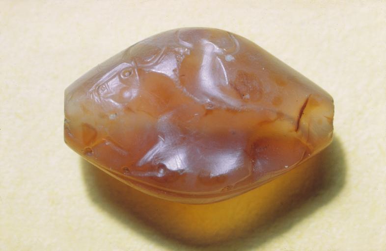 | Keywords: Minoan - Sealstone of Two Bulls Reclining - Walters 42402.jpg Carved sealstones were popular ornaments among Bronze Age Minoans and Mycenaeans and served as insignia of rank and social status They were influenced by the elaborate traditions of stamp and cylinder seals developed in the Near East and Egypt The frequent appearance of bulls on seals may be inspired by the many Minoan palace wall-paintings and reliefs featuring the animal In this sealstone the head and neck of the bull in the background are seen from behind between 1600 1500 BC agate cm 1 6 2 5 1 accession number 42 402 7094 Henry Walters Baltimore 1913 mode of acquisition unknown Walters Art Museum Henry Walters Acquired by Henry Walters 1913 place of origin Crete Greece Walters Art Museum license Ancient Greek art in the Walters Art Museum Minoan seals Minoan sealstones device Media contributed by the Walters Art Museum needs category review |