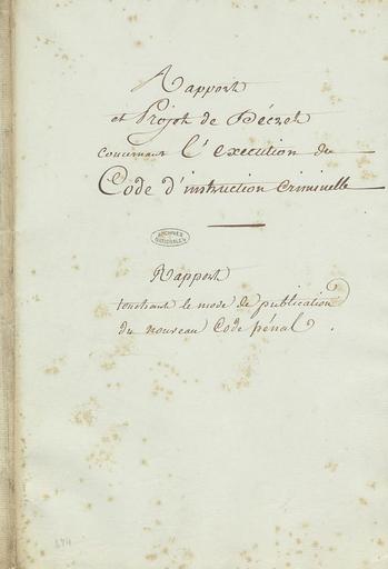 | Keywords: Minute du rapport fait à Napoléon Ier sur la promulgation et la publication du nouveau code pénal, faisant office de travaux préparatoires au code - Archives Nationales - BB-3-191 - (1 sur 16).jpg  Transcribe Archives Nationales de France Minute du rapport fait à Napoléon Ier sur la promulgation et la publication du nouveau code pénal faisant office de travaux préparatoires au code 1810-02-24 paper Institution Archives nationales France object history exhibition history credit line Archives Nationales cooperation project http //www archives-nationales culture gouv fr/visites-virtuelles/le-secret-de-l-etat/ PD-old-100-1923 accession number BB/3/191 Collections of Archives nationales France 1810 in France Media contributed by the Archives Nationales France /8 Le secret de l ™Ã‰tat - Archives Nationales Napoleon I of France in 1810 Code pénal de 1810 |