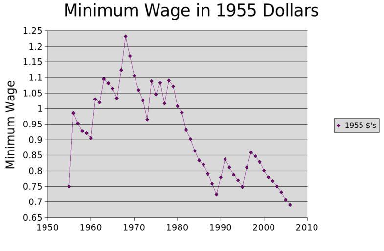 MAKE A MEME View Large Image Minwage3.png Graph of minimum wage adjusted to 1955 Dollars Created by me based on the data at the US Department of Labor and some math I got from some people on freenode 2006-12-07 own assumed Bluefoxicy Minimum wage