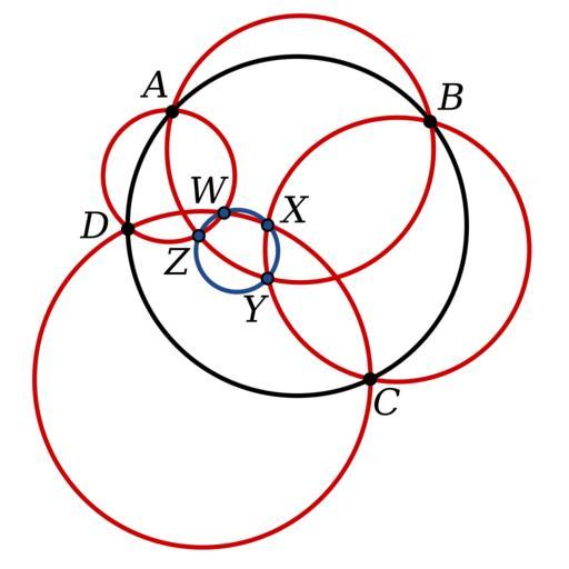 Keywords: Miquel's Theorem 2.svg en A diagram showing an application of Miquel's theorem Take a circle with four points A B C D and the four circles passing thorough adjacent points Then the intersections of these circles when one circle provides only two intersections W X Y Z all fall on a common circle blue Own Inductiveload Miquel's theorem |