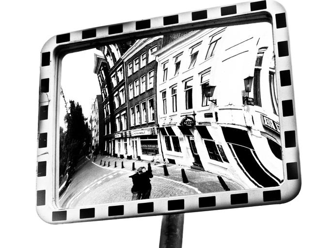 Keywords: mirror street buildings amsterdam netherlands dutch holland black and white traffic