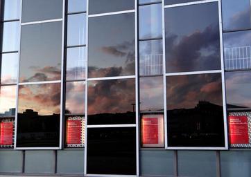 Keywords: mirroring sky clouds window facade architecture reflection light kassel theater blue hour