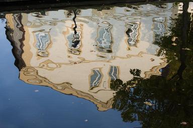 Keywords: mirroring water building old sky evening waters mood blue yellow beige cream art lake beautiful atmosphere pond fountain effect