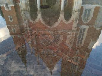 Keywords: mirroring water paving stones fountain graz church transparent brick neo gothic architecture