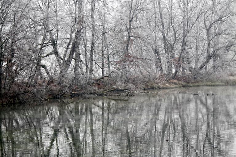 Keywords: mirroring water reflection winter snow frost reflection landscape river trees