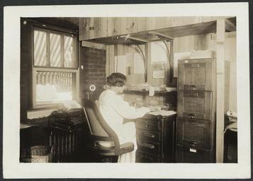 | Keywords: Miss Elizabeth Kalb 275001v.jpg Title Miss Elizabeth Kalb - Suffragist Editorial Room Contributor Names Harris Ewing Washington D C Photographer Created / Published 1919 Aug Subject Headings - National Woman's Party - Suffragists--United States--1910-1920 - Women--Suffrage--Washington D C - Kalb Elizabeth Green - The Suffragist serial --Editorial staff - Photographs - United States -- District of Columbia Genre Photographs Notes - Summary Photograph of Elizabeth Green Kalb facing right with back to camera seated at paper-covered desk in corner office with typewriter and file cabinets nearby - Title and information transcribed from item - Photograph published in The Suffragist 7 no 31 Aug 9 1919 7 Medium 1 photograph print; 5 x 7 in Call Number Location National Woman's Party Records Group II Container II 275 Folder Individual Photographs Nos 209-218 K Source Collection Records of the National Woman's Party Repository Manuscript Division Digital Id http //hdl loc gov/loc mss/mnwp 275001 http //www loc gov/collections/women-of-protest/ sp 5 PD-old suffragettes |