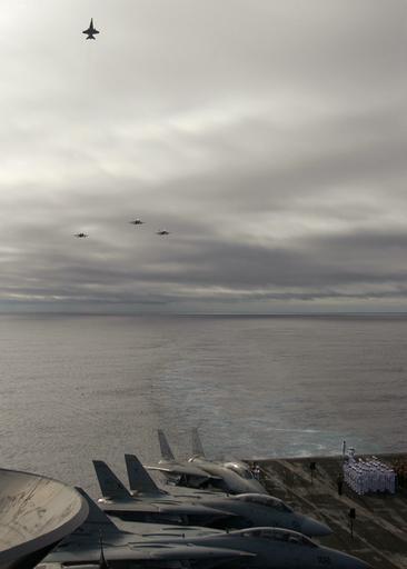 Keywords: Missing Man Flyover formation.jpg Pilots assigned to Carrier Air Wing Three CVW-3 perform a Missing Man Flyover formation above USS Harry S Truman CVN 75 during a wreath laying ceremony held on the flight deck in memory of Capt Franklin Hooks II assigned to the Silver Eagles of Marine Fighter-Attack squadron One One Five VMFA-115 Hooks died when his F/A-18 Hornet jet crashed while conducting exercises off the aircraft carrier USS Harry S Truman near the Azores Islands on June 26 Hooks began his military career as an Electronics Technician when he joined the Navy in 1990 In 1993 he was appointed to the U S Naval Academy from which he graduated in 1997 Truman CVN 75 is participating in Majestic Eagle a multinational exercise being conducted off the coast of Morocco The exercise demonstrates the combined force capabilities and quick response times of the participating naval air undersea and surface warfare groups Countries involved in the U S -led exercise include the United Kingdom Morocco France Italy Portugal Spain and Turkey Truman's participation in Majestic Eagle is part of her scheduled deployment supporting the Navy's new fleet response plan FRP Summer Pulse 2004 the simultaneous deployment of seven carrier strike groups CSGs demonstrating the ability of the Navy to provide credible combat across the globe in five theaters with other U S allied and coalition military forces http //www navy mil/view_image asp id 16280 2004-07-18 Photographer's Mate Airman Apprentice Jay C Pugh PD-USGov-Military-Navy PD-USGov Missing man formations Flypasts at sea Summer Pulse 2004 MEDSHARK-Majestic Eagle 2004 |