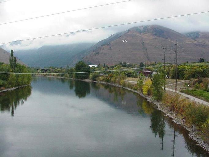 Keywords: Missoula mount sentinel.jpg en view of Mount Sentinel from Higgins Bridge in Missoula http //pdphoto org/PictureDetail php mat pg 7753 PD photo org 1999-09-27 Cc-zero Missoula Montana 1999 in Montana Clark Fork river