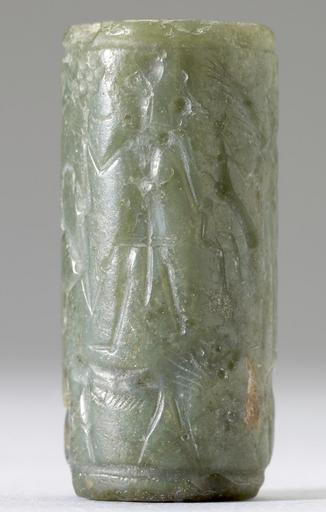 | Keywords: Mitannian - Cylinder Seal with a Row of Human Figures above Animals - Walters 42685 - Side E.jpg This seal depicts a group of Mitannian deities A winged male stands between two bulls and holds aloft a winged disk from which a deity emerges Two male figures kneel on the backs of the bulls in adoration A winged female stands holding small animals and a male deity stands on a lion's back He holds a weapon possibly a mace in one hand and a horned animal in the other; a bird perches on his shoulder The tradition of representing deities on the backs of animals came from central Anatolia between 1500 1300 BC Mitannian carved jadite cm 3 2 1 5 accession number 42 685 17970 Sadie Jones Mrs Henry Walters New York date and mode of acquisition unknown Sale Joseph Brummer New York 1941 Walters Art Museum 1941 by purchase Museum purchase 1941 place of origin Mitanni in Mesopotamia Walters Art Museum license Cylinder seals in the Walters Art Museum Mitannian cylinder seals Mythological hybrids Art of Mesopotamia in the Walters Art Museum Walters Art Museum cylinder seal impressions Cylinder seals 7-dot glyphs Archaeological star glyphs Lions in art of the ancient Near East Birds in art of the ancient Near East Animals in art of the ancient Near East Media contributed by the Walters Art Museum needs category review |