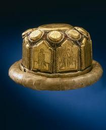| Keywords: Mitra Tchudov-klostret - Livrustkammaren - 38923.tif LSH artwork sv Krigsbyge från Narva <br/>Mitra av hattformig modell med cylindrisk kulle med svagt rundad kant Vulstformigt brätte b ca 30 mm klätt med pergament ursprungligen med skinn Kullen klädd med delvis mycket slitet karminrött siden nertill vid brättet ring av förgylld silverplåt b 30 mm med graverad gammalslavisk text översättning se Bodin <br/>År 7 159 november 17 dagen gav statssekreteraren Michail Danilovs hustru änkan Uljana dotter till Vasilij denna biskopsmössa till Tjudovklostret till den undergörande Aleksijs hem till minne av sin make Michail Danilovitj eremitmunken Misail och sin dotter Ksenia för sin själ<br/>Därovanför en krans med sex ursprungligen nio helgonbilder graverade på rektangulära plåtar med trepassformig överdel mellersta bågen spetsig h 83 mm b 58 mm gammalslaviska texter <br/>1 - ett manligt helgon med otydlig text pete ; 2 - ärkeängeln Gabriel achange gabri ; 3 - Maria mrthy mätär Theo - Guds moder ; 4 - ärkeängeln Mikael achage michail ; 5 - evengelisten Petrus apoto petr ; 6 - helgon i biskopsdräkt st alekse miro <br/>På kullens översida en krans med nio runda plåtar med serafer och keruber fyra stycken med text serafim fem med cherubi <br/>Mitt på kullen en stor rund plåt d 102 5 mm med Maria och Jesusbarnet text mrthy Guds Moder <br/>Runt plåtarna broderier med silke silvertråd och -paljetter två ovala genomborrade glaspärlor bevarade <br/>Hatten invändigt stoppad och klädd med blekrött siden original caption mitra Tchudov-klostret - LRK 5388 Slaget vid Narva 1650 silver - silver - silk Färg röd karminröd material siden - parchment size mm 265 bräm g 6145 size mm 150 ca size mm 195 kulle LRK Karl XII av Sverige Mille ans de tradition chret 1988-1989 Kungens lockpipa 1995-1996 Karl XII och Peter den store Peter den store och Karl XII - i krig och fred 1998-1999 Livrustkammaren Krigsbyte 2007-2008 300-årsminnet av slaget vid Poltava / Poltava 300 Years Eremitaget och Kreml-museet 2009-2010 achange gabri Gabriel achage michail Mikael mrthy Mätär Theou - Guds Moder Maria apoto Petr S t Petrus Per st alekse miro S t Alexej Miro achange gabri Gabriel achage michail Mikael mrthy Mätär Theou - Guds Moder Maria apoto Petr S t Petrus Per st alekse miro S t Alexej Miro place of origin original filename lm_t05141 42045 inventory number LRK 5388 38923 CC-BY-SA <gallery caption Different images of same object > File Rysk-ortodox mitra från 1650 - Livrustkammaren - 47481 tif </gallery> Battle of Narva 1700 Headgear Media contributed by LSH dim-with multiple size templates Media contributed by LSH 2014-11 |