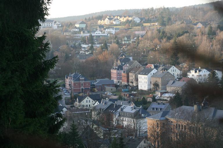 Keywords: Mitteldorf, Fuchswinkel und Fuchsstein.JPG Schönheide im Erzgebirge Vom Denkmal am Knock geht der Blick über Mitteldorf und Fuchswinkel zum Fuchsstein Rechts das imposante Gebäude der Geschwister-Scholl-Schule die von 1896 bis 1998 gebaut wurde Die roten Ziegelbauten links sind vorn die Post von 1891 und dahinter das Hotel zur Post etwa aus der gleichen Zeit Mehrfamilienhäuser aus der Gründerzeit und später zeigen die stadtähnliche Bebauung aus der Zeit der Verstädterung Neuere Bauten aus den 1990er und 2000er Jahren finden sich im oberen Bildbereich am Fuchsstein own Klaaschwotzer 2009-09-21 Cc-zero Check categories 2013 October 28 Schönheide |