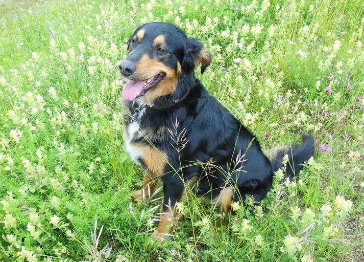 Keywords: mixed breed dog hybrid meadow dog dog on meadow flowers nature hundeportrait